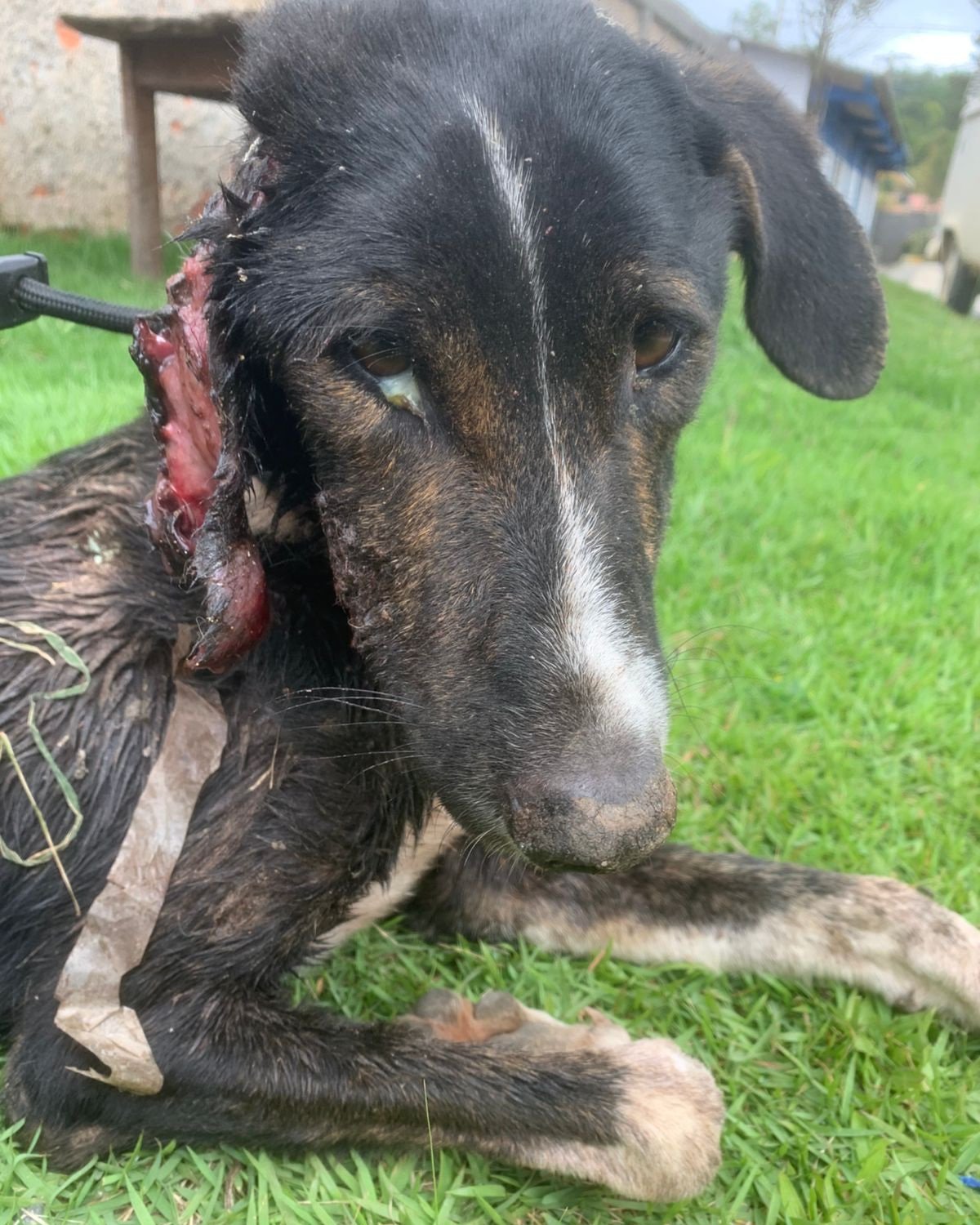 Fui resgatado após ser encontrado com uma lesão enorme na região da orelha, cheia de bichinhos, eu estava extremamente caquético, debilitado, desidratado e com hipotermia. Meu estado é crítico. As tias farão todo possível para me salvar.