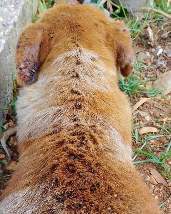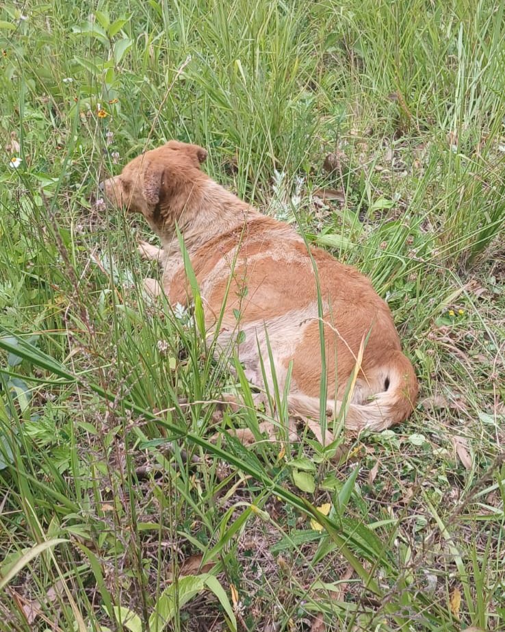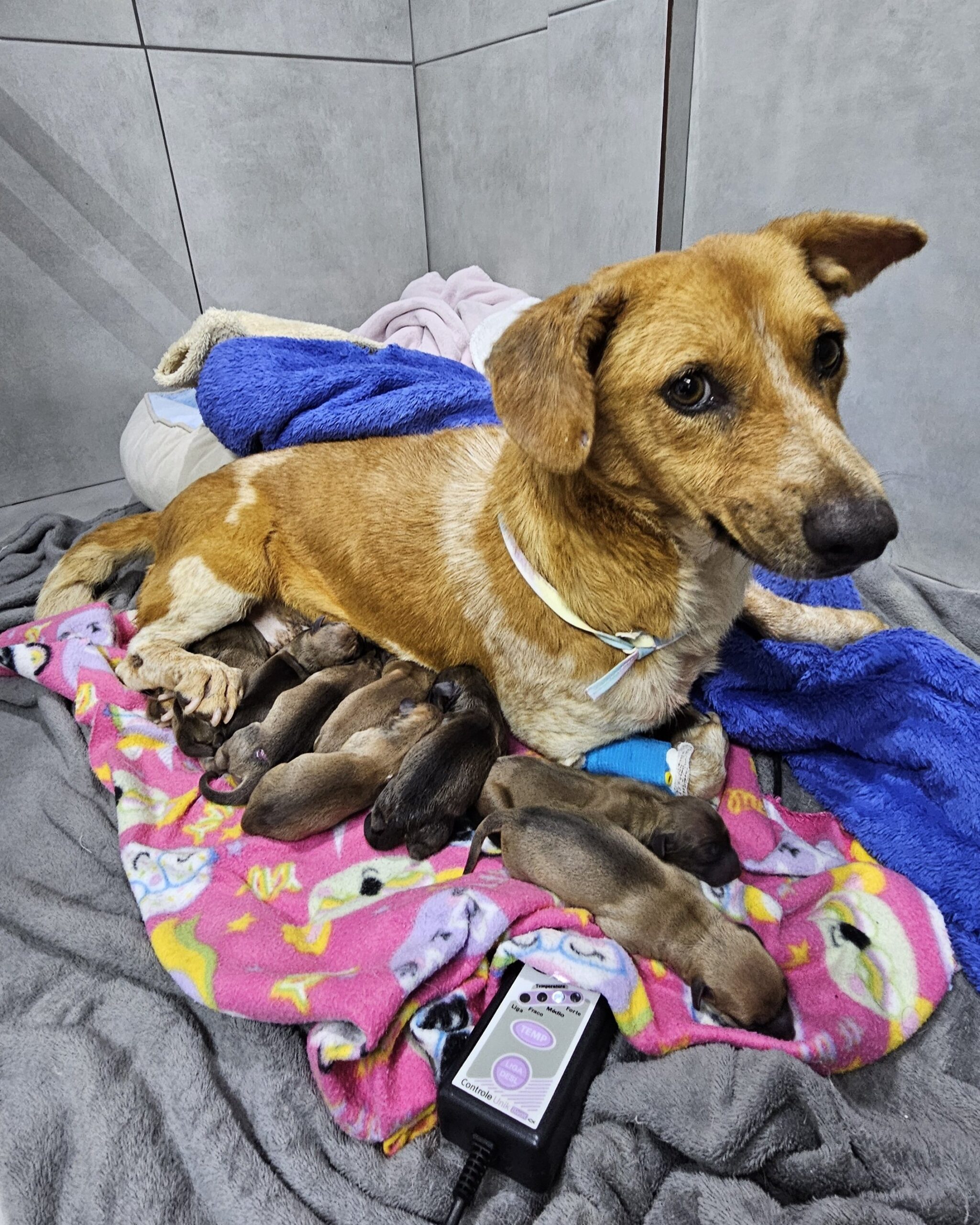 Fui resgatada após ser encontrada caída no mato, muito debilitada e ofegante. Estava esperando bebês e com uma infestação gigantesca de carrapatos por todo corpo, cheguei na clínica com febre. Como estava prenha não podia tomar medicação, as tias tiveram que tirar os carrapatos. Fiz ultrassom e viram que eu precisava de cesária de emergência, um dos fetos estava morto. Meus exames estavam muito ruins, após a cirurgia precisei de transfusão de sangue e agora vou me recuperando e cuidando dos meus bebês.