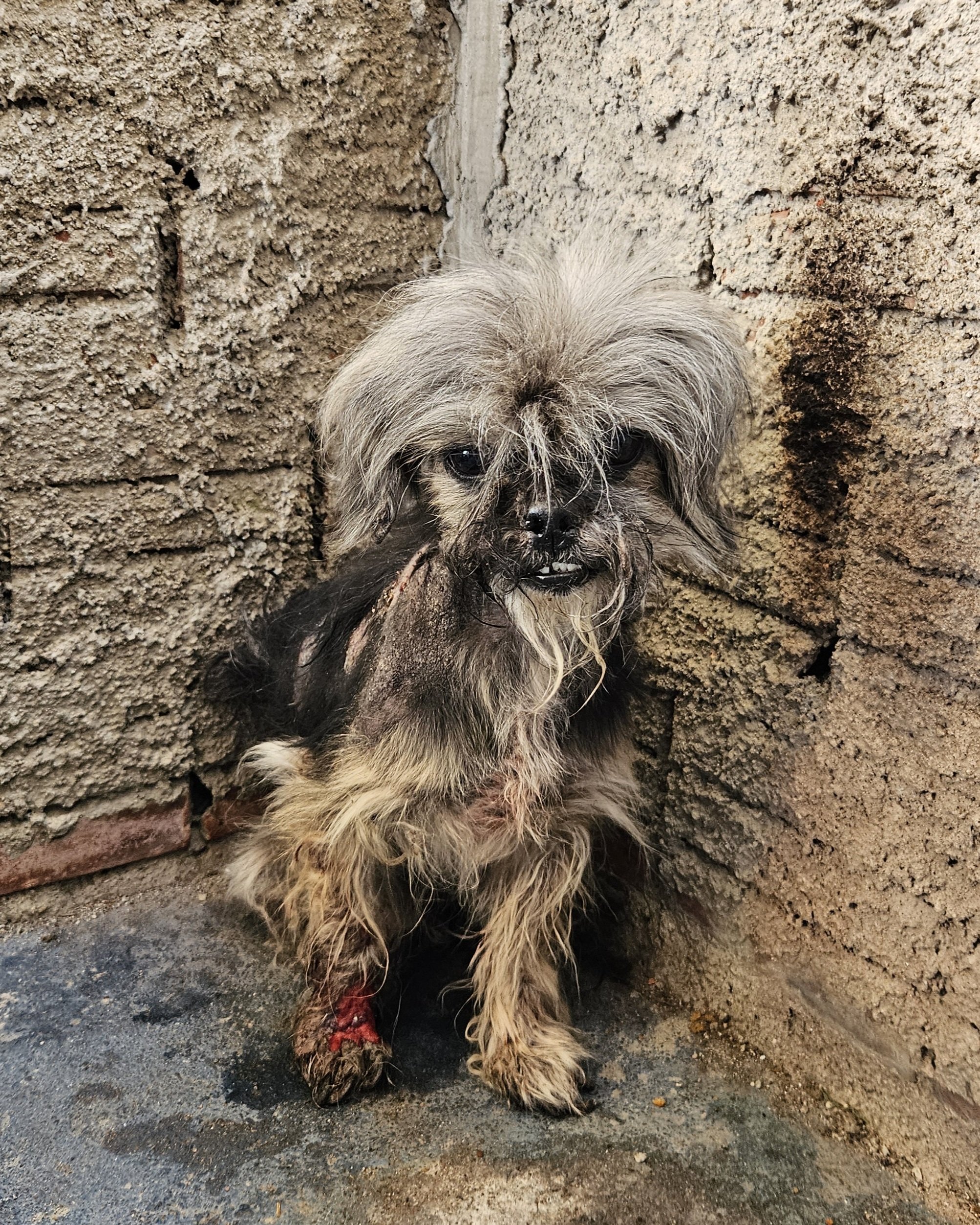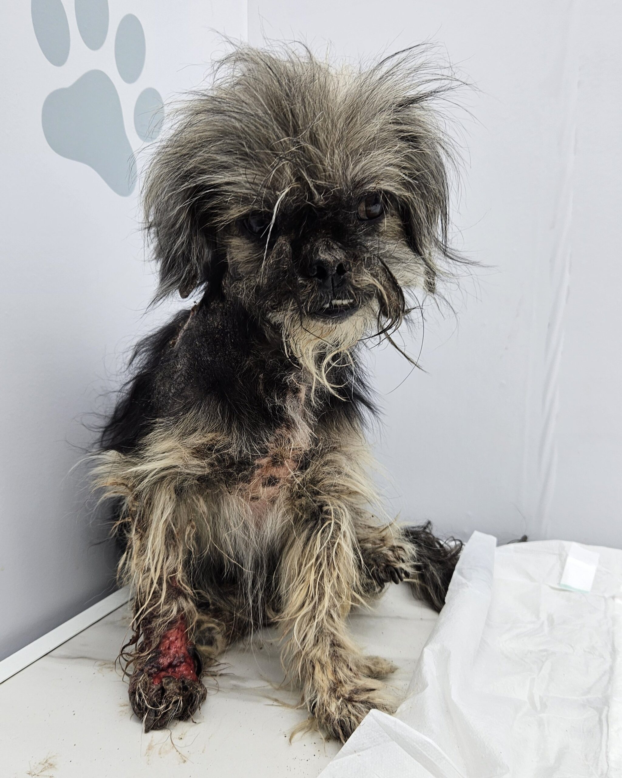 Fui resgatado após ser encontrado na rua extremamente debilitado, desnutrido, anêmico, tomado pela sarna, crostas por todo corpo, pelo embolado, lesões abertas e infestado por uma quantidade absurda de pulgas e carrapatos. Agora as tias vão fazer a limpeza, tosa, banho e todos os exames para saber qual o tratamento necessário.