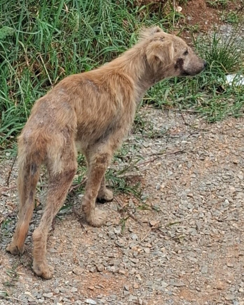 Fui resgatada após ser encontrada machucada, extremamente magra, tinha uma lesão grave com perfuração no focinho, além de outras perfurações na perna. Eu tinha feridas com muitas crostas e sarna pelo corpo todo. Agora as tias vão cuidar de mim até eu poder ganhar uma família.