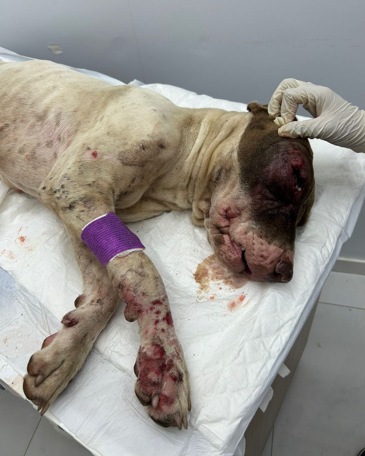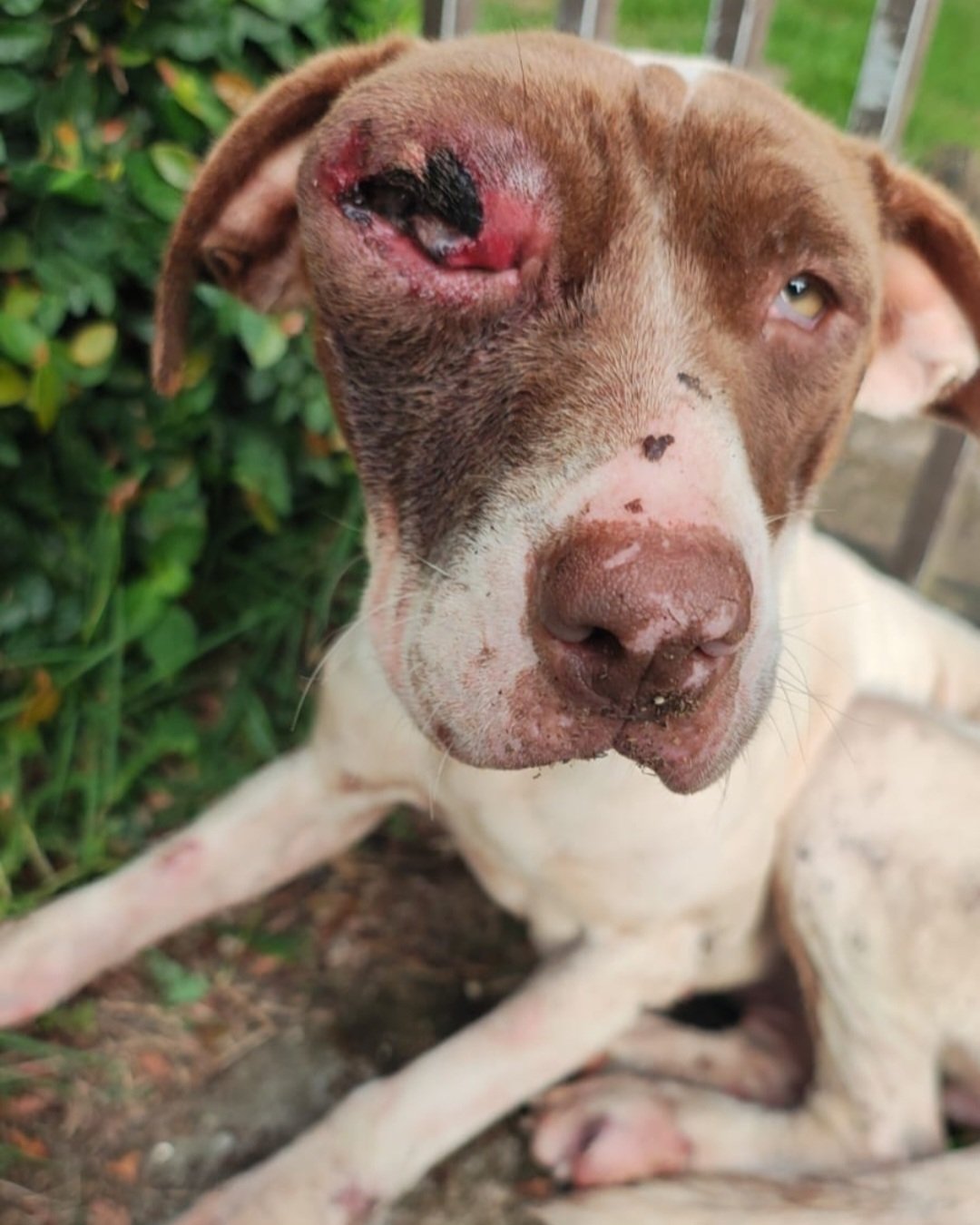 Fui resgatada após ser encontrada com uma lesão grave no olho, cheia de bichinhos, eu não lembro se fui agredida, atacada ou atropelada. Estava morrendo de fome e sede, com febre alta, muito magra, com feridas antigas espalhadas pelo corpo e infestada de pulgas e carrapatos.