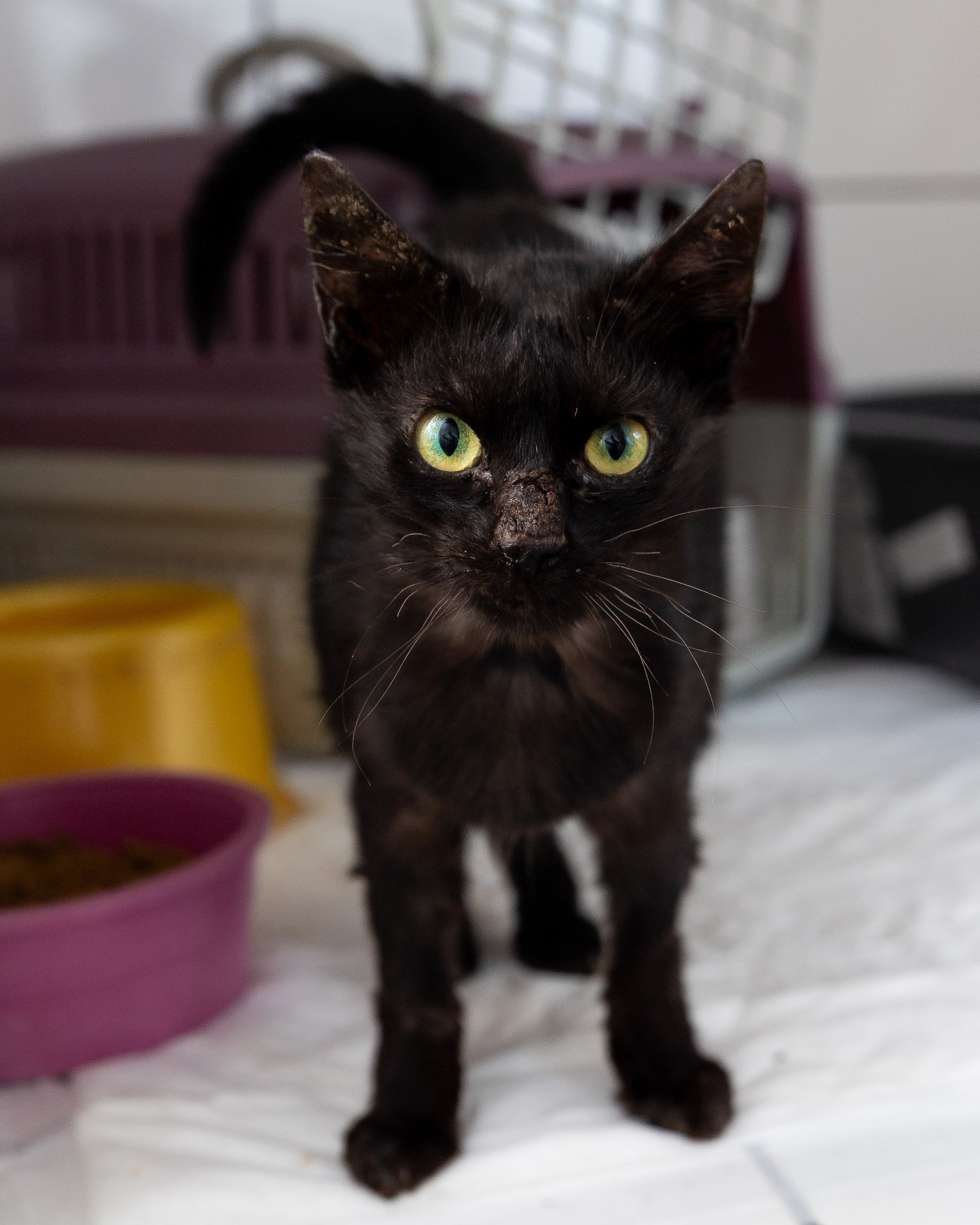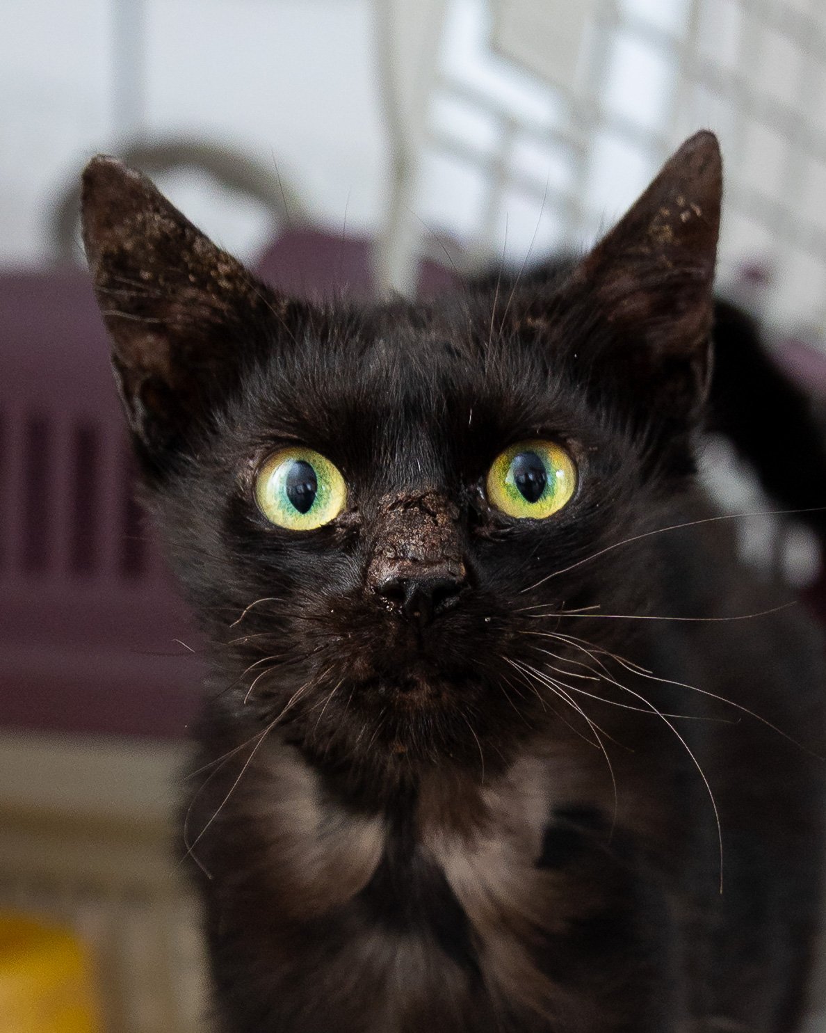 Fui resgatado após ser encontrada extremamente magra e debilitada, cheia de lesões na pele, todos os humanos da vizinhança me rejeitavam e não me queriam por perto. Eu estava desidratada, com alopecia, tinha descamação e coceira intensa. Eu pesava apenas 1,4kg. As lesões de pele foram causadas por fungos, é uma doença altamente contagiosa, que também pode ser transmitida para humanos. Felizmente sou FIV e FELV negativo. As tias estão estão fazendo todo tratamento necessário.