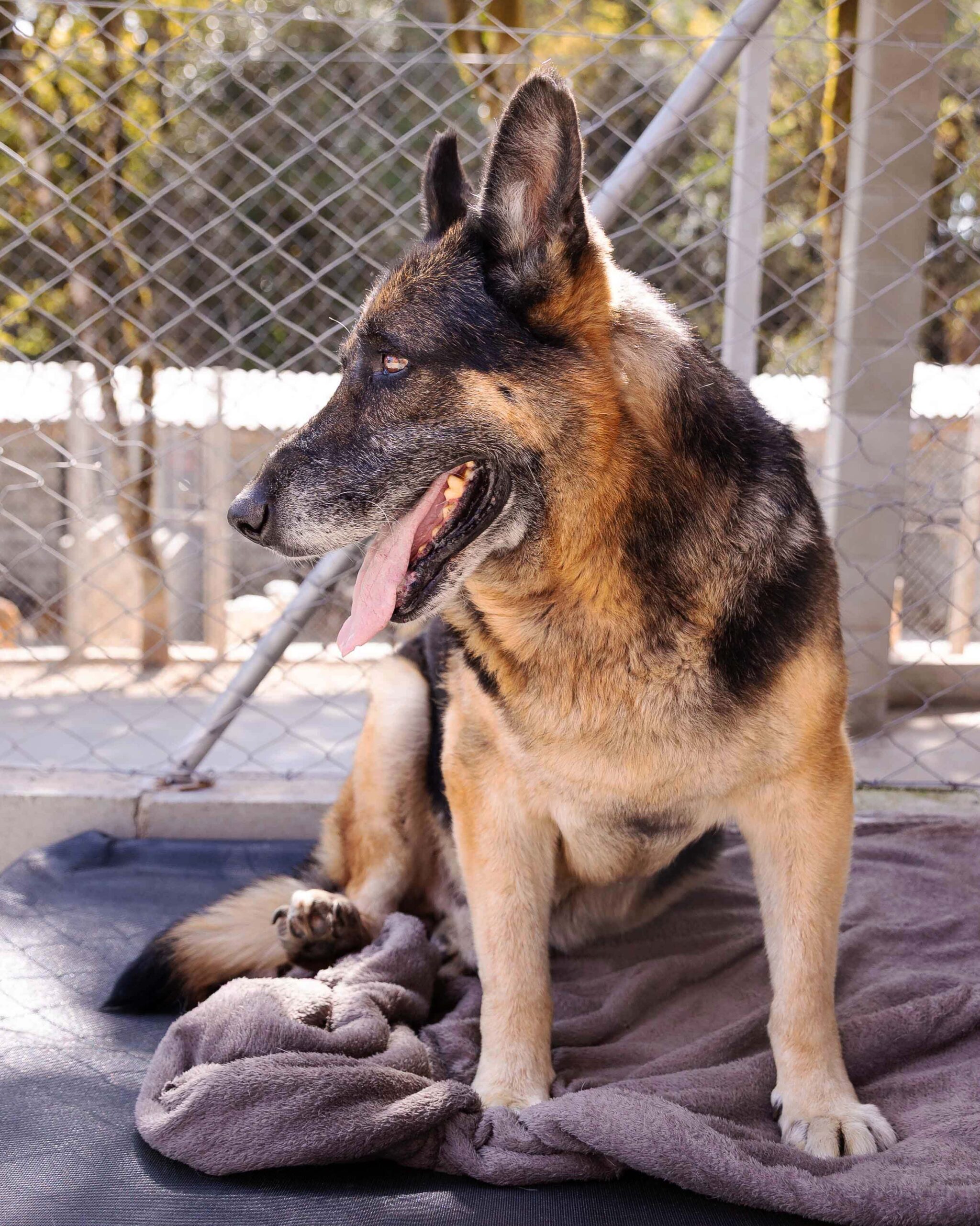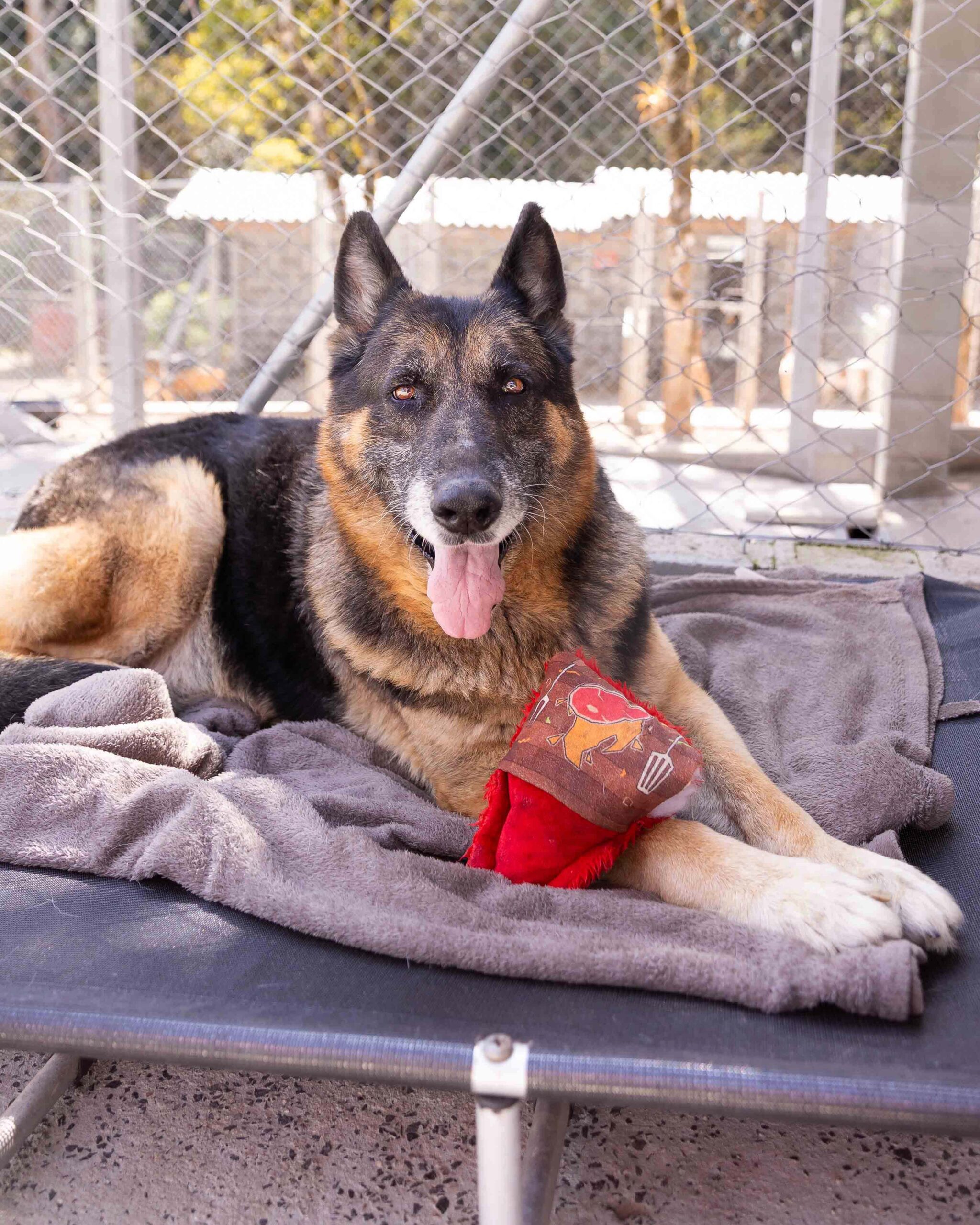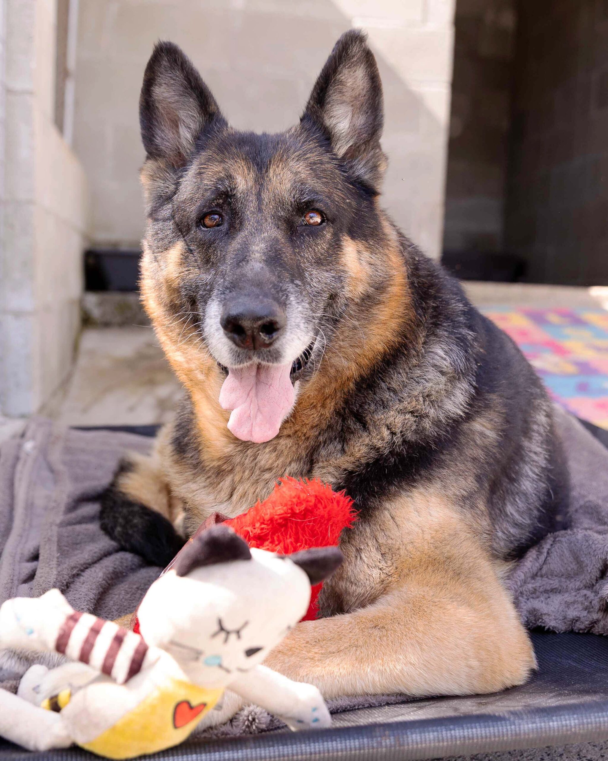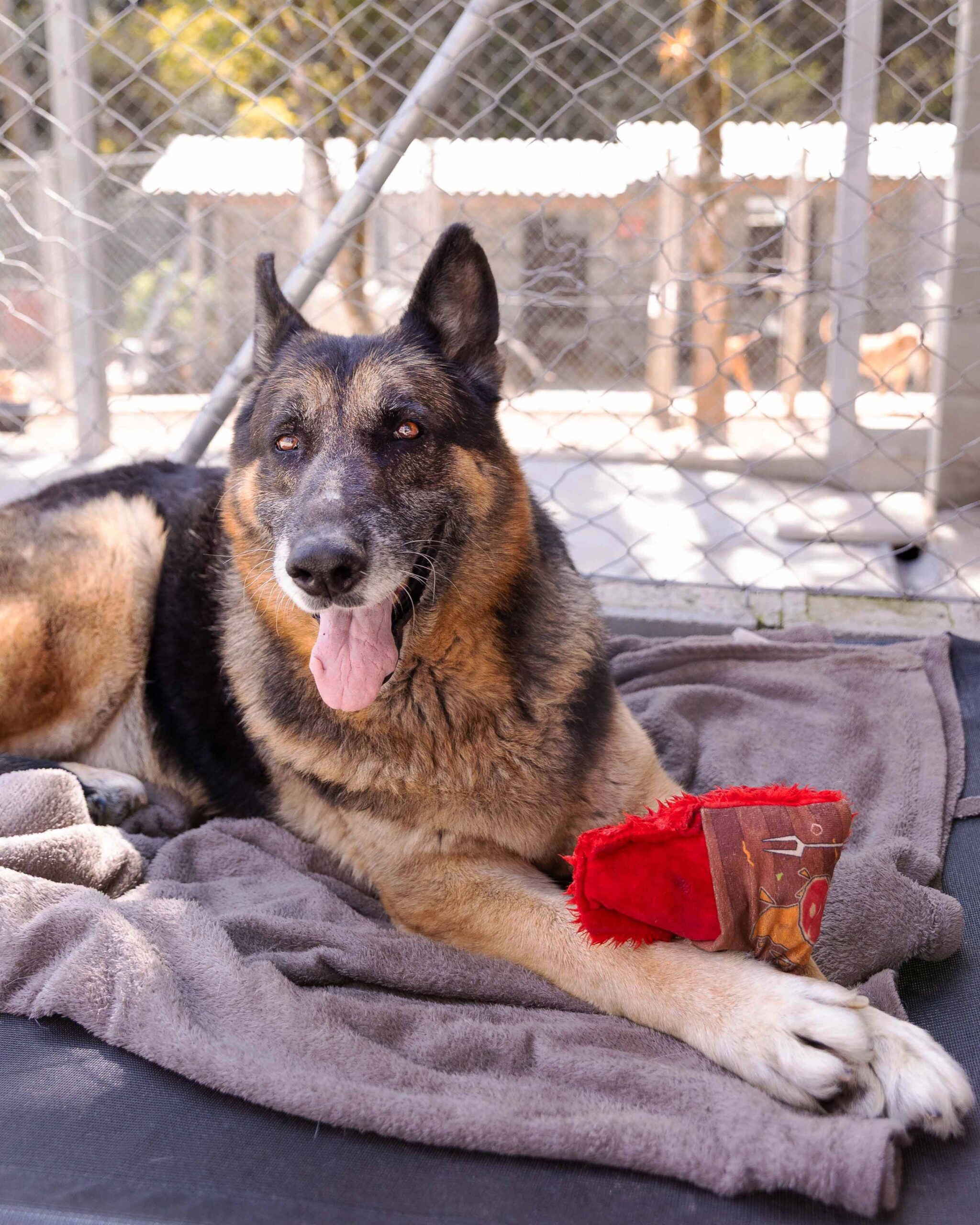 Fui resgatado após uma denúncia de maus-tratos. Sou um Pastor Alemão, e era do Exército, quando me aposentei achei que ia ter uma vida de paz e descanso, mas fui adotado por um “humano” que me deixou amarrado com um enforcador que já estava afundado no meu pescoço, sem comida nem água, ficava no piso gelado de um galpão. Estava extremamente debilitado, caquético, tinha feridas pelo corpo com bichinhos. Agora nem pareço o mesmo, estou lindo e forte, mas sou um idosinho, preciso de cuidados e muito carinho. Amo meus bichinhos de pelúcia 🙂