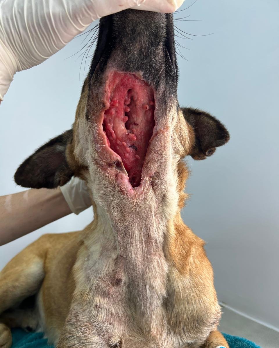 Fui resgatado após ser encontrado embaixo do porão de uma casa, com uma lesão enorme no pescoço, provavelmente causada por coleira ou corrente aperatada, a ferida era profunda e já tinha bichinhos até na minha boca, também tinha outra lesão com bichinhos próximo ao meu ânus, além disso estava infestado de carrapatos. Eu estava com muita dor, precisei ser sedado para a limpeza.