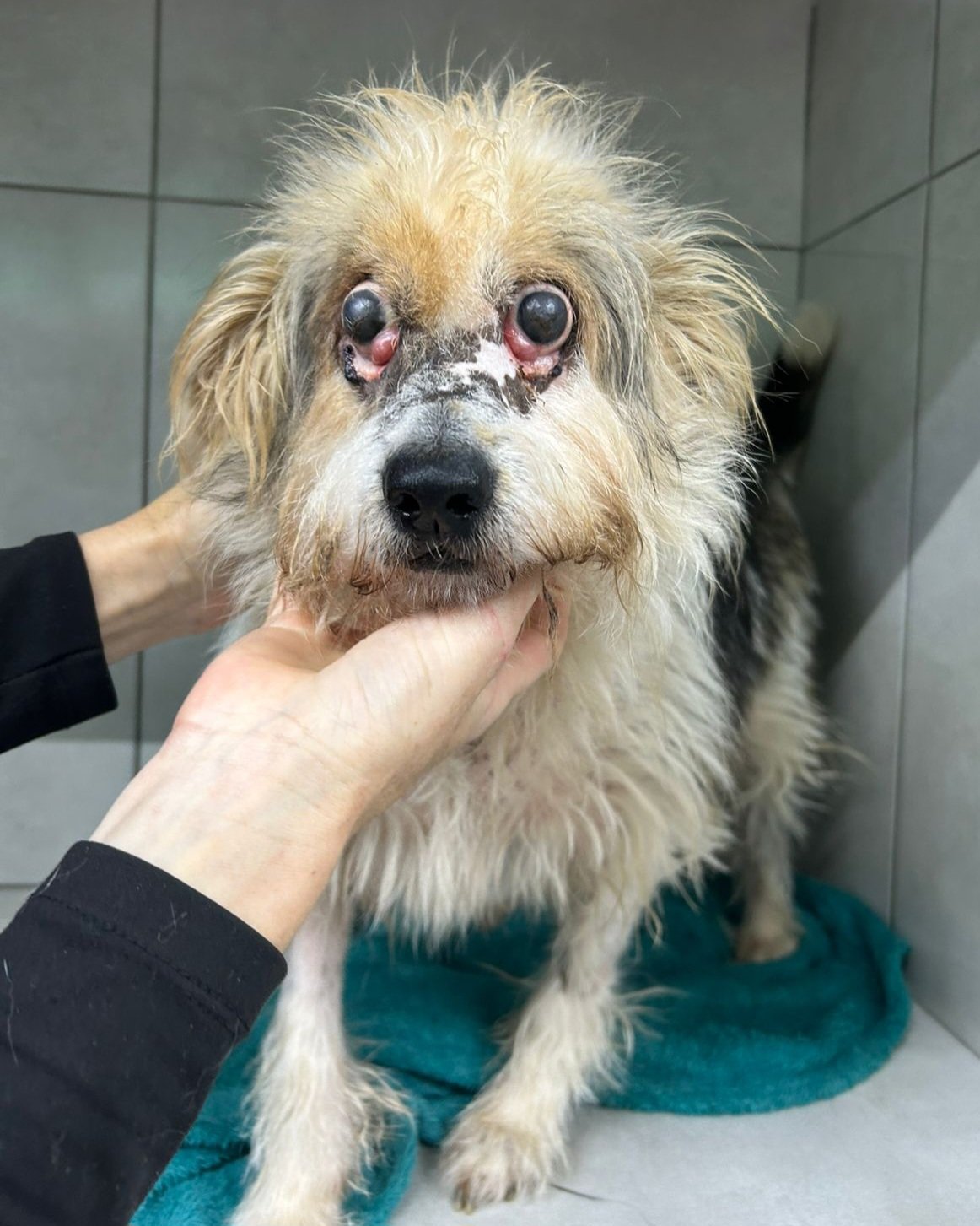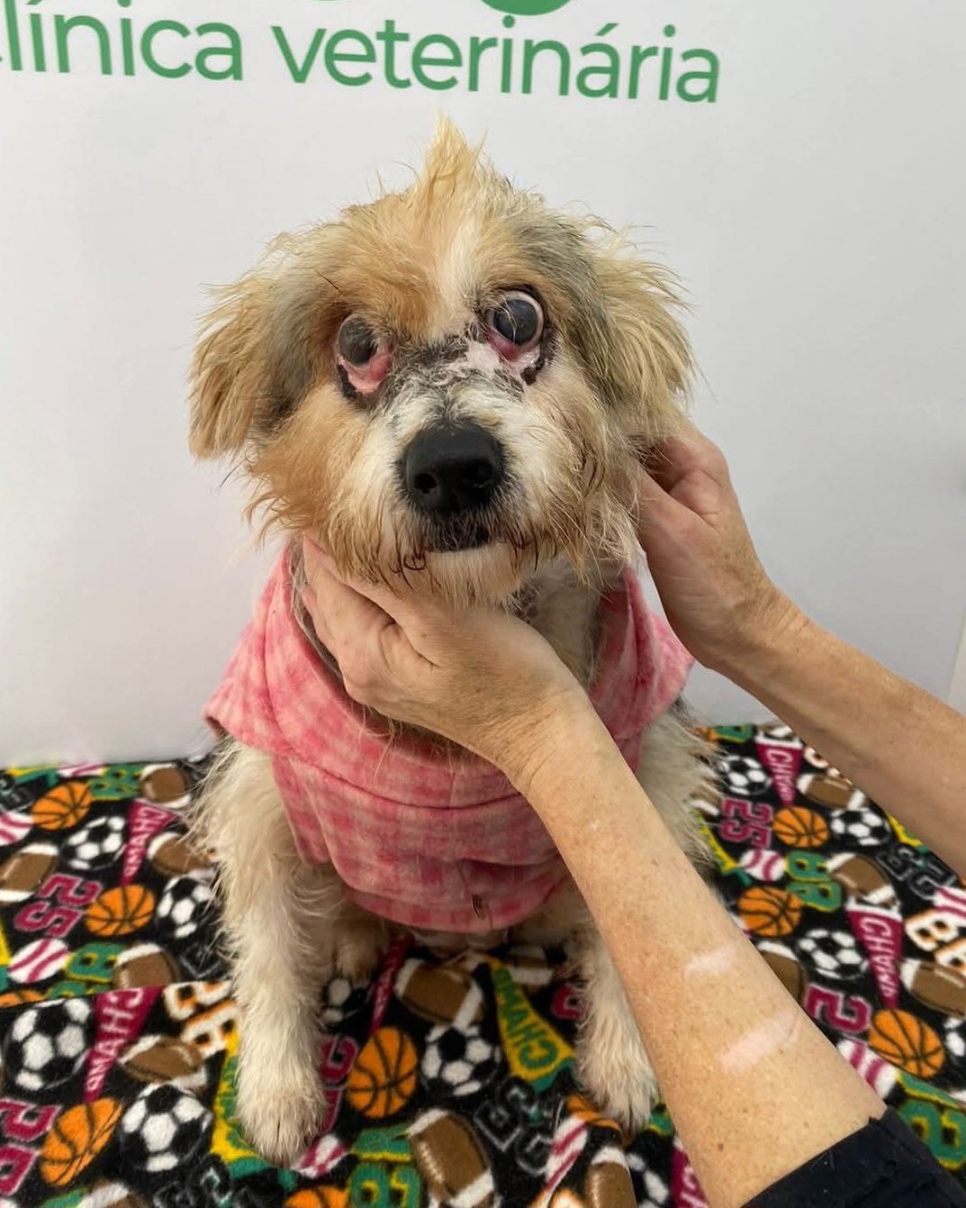 Fui resgatada com lesões gravíssimas na face e no corpo, extremamente magra, com muitas crostas e pele seca. Estava muito assustada, com febre alta e lesões profundas em volta dos olhos que já tinha bichinhos, estava sem enxergar. Fiquei internada por um tempo, até a minha pele melhorar e eu me recuperar e então foi feita a cirurgia para fechar um pouco a pele ao redor dos olhos e corrigir a terceira pálpebra, eu tinha reflexos, então as tias fizeram de tudo para tentar recuperar minha visão – tratamento com colírios pomada e banho medicamentoso. Eu voltei à enxergar um pouco, mas infelizmente eu perdi toda pálpebra e o músculo que faz piscar, então não adianta fazer uma cirurgia e colocar pele de outra região porque eu continuaria sem piscar. Durmo de olhos abertos, mas já estou acostumada. Precisarei para sempre dos colírios e banhos medicamentosos. Apesar de tudo, sou extremamente feliz e brincalhona! Recentemente as tias descobriram um inchaço na minha garganta e infelizmente a suspeita é de tumor, elas estão esperando o resultado do exame.