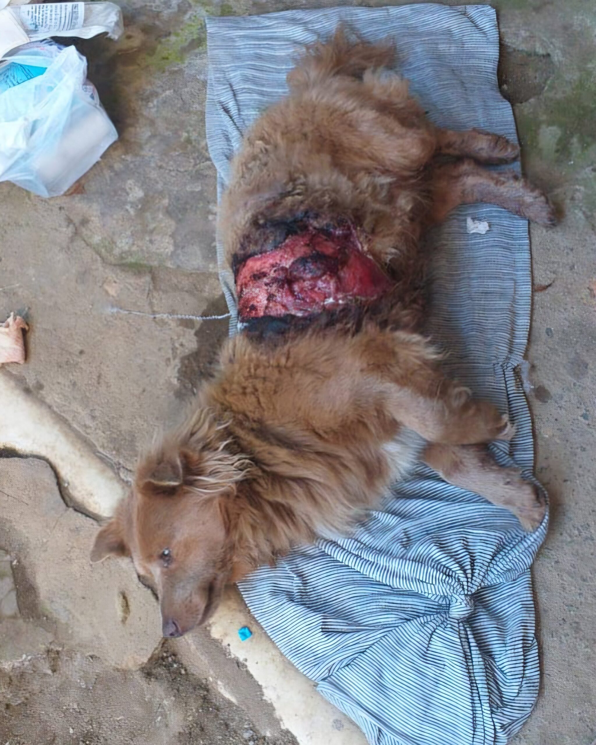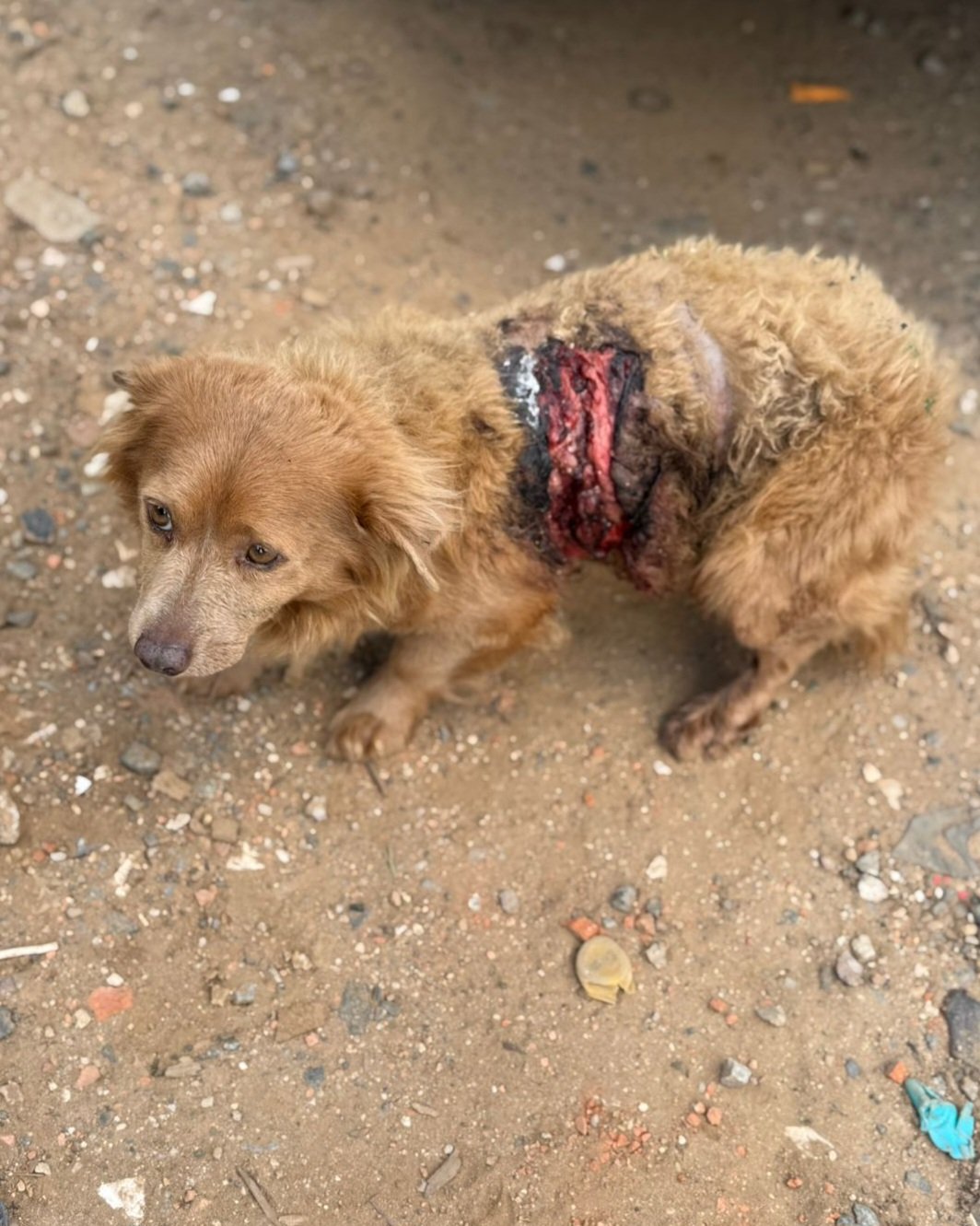 Fui resgatado pós ser atacado por outros cães, já fazia um dia que eu estava machucado quando as tias foram me buscar. Eu estava com uma ferida enorme na região do abdômen e das costas, com muito tecido necrosado, estava com hipotermia e infestação de pulgas e carrapatos. Agora terei todo cuidado e tratamento necessário.