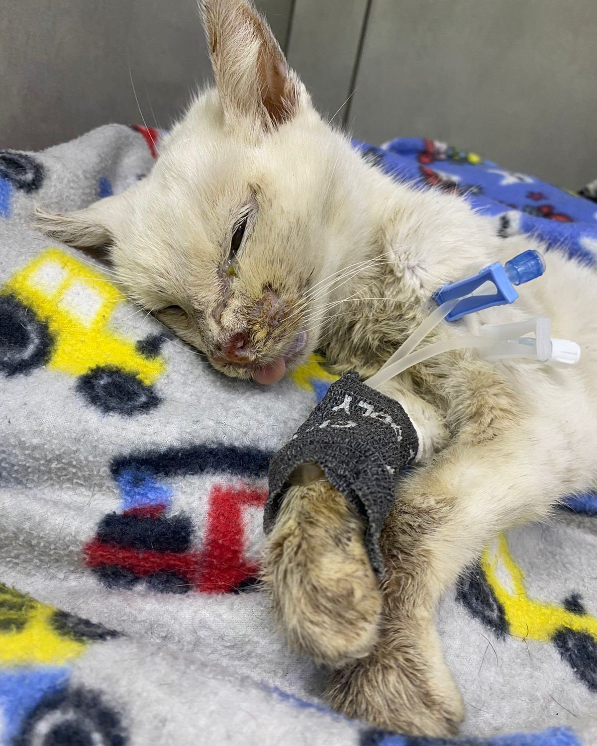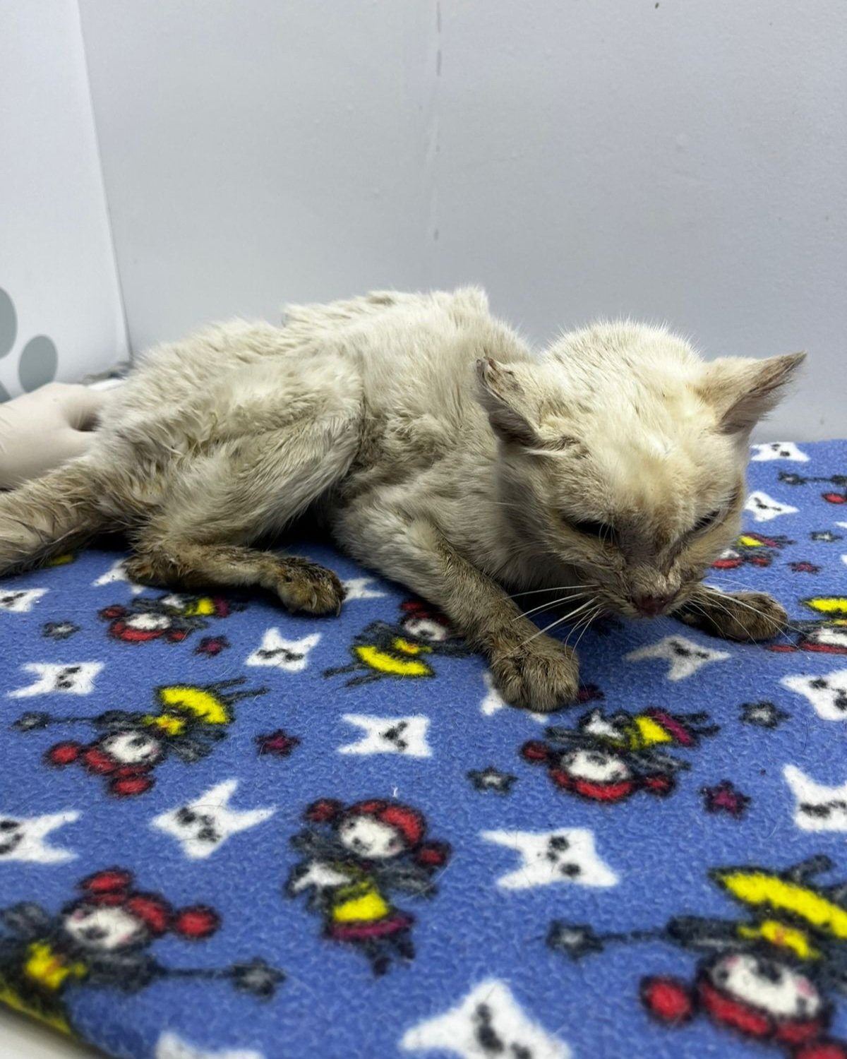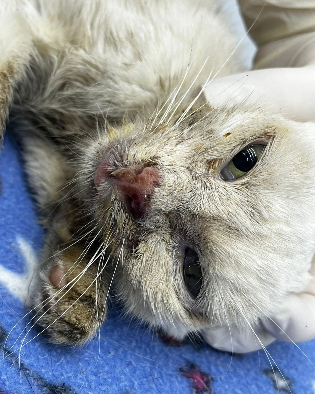 Fui resgatada após ser encontrada rm um terreno baldio, no meio do lixo, estava extremamente debilitada, caquética, com desidratação grave, hipoternia, hipotensão, hipoglicemia e mucosas pálidas. Estava com a mandíbula travada e sangramento na boca, também tinha lesões no nariz. Precisei de transfusão de sangue por causa de uma anemia grave. As lesões podem ser esporotricose ou carcinoma, as tias estão fazendo os exames. Infelizmente sou FELV positivo.
