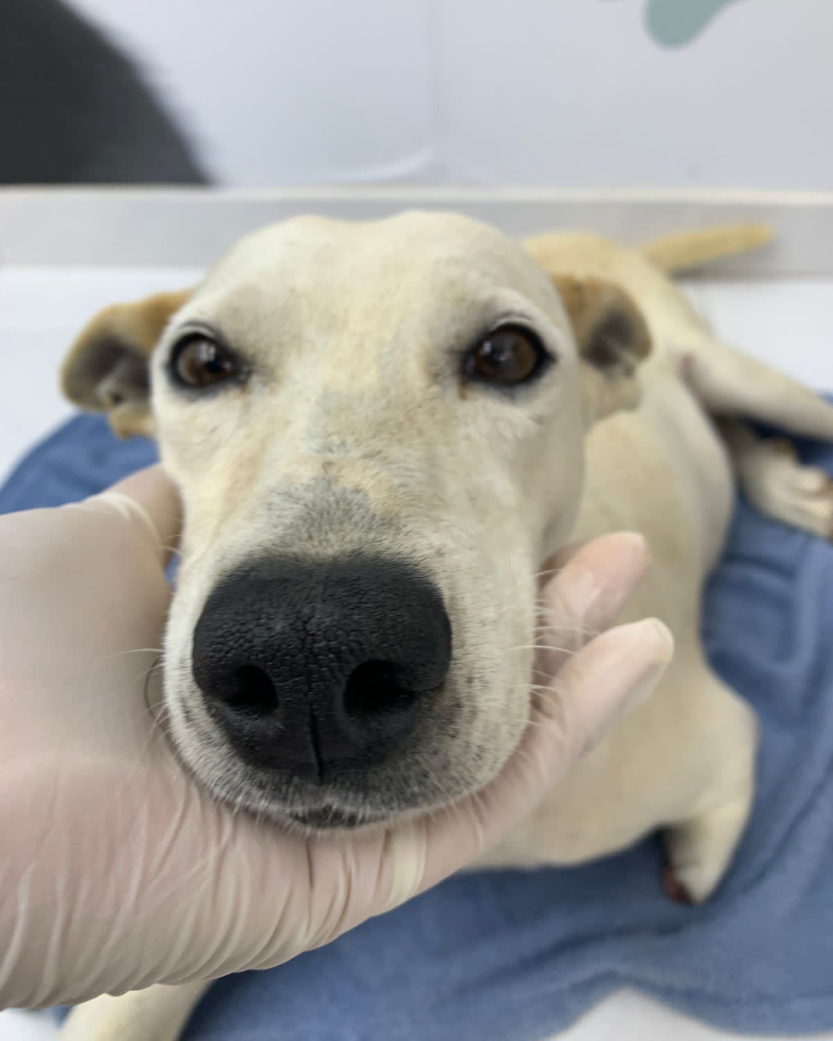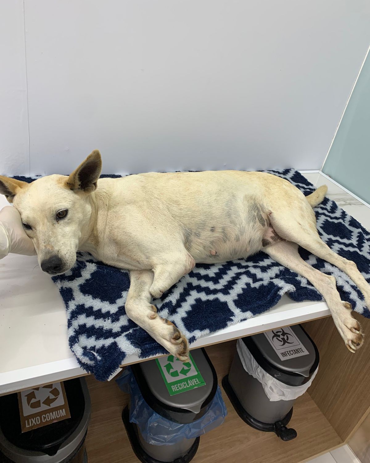 Fui resgatada após ser atropelada, eu já não tinha uma das patinhas, mas era uma amputação antiga Eu não conseguia ficar em pé, estava com muita dor na coluna, hipertermia, infestada de pulgas e lesão com bichinhos. As tias vão fazer todos os exames para eu ter o tratamento necessário. Você pode ajudar?
