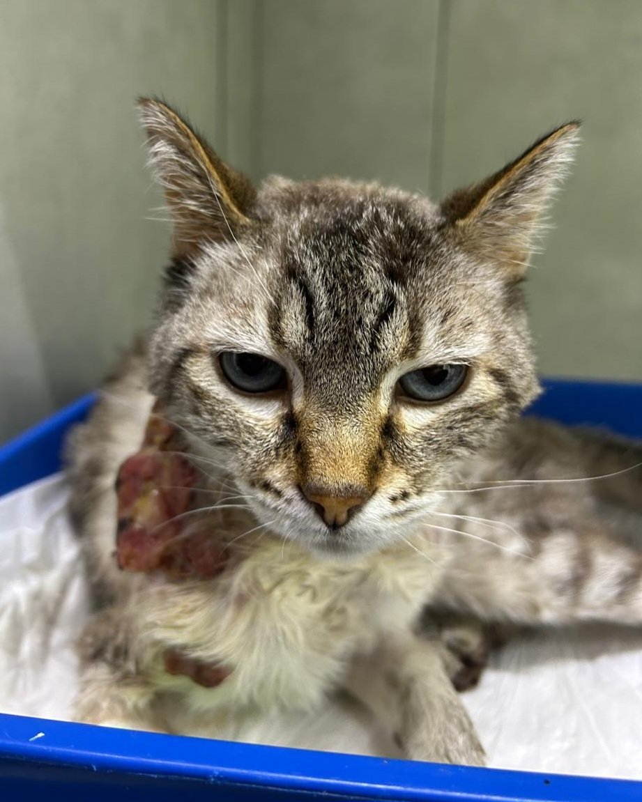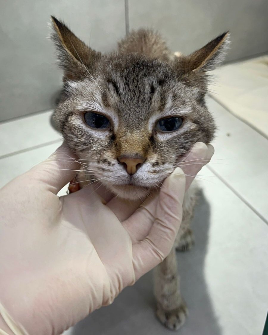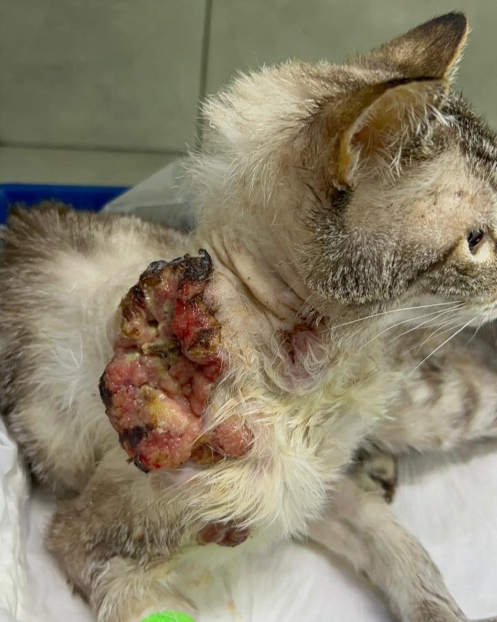 Fui resgatado após ser encontrado com uma lesão bem grande, aberta e ulcerada na região do ombro, era um tumor. A parte que as tias acharam estranha foi porque meus pelo estava tosado em volta, indicando que fui atendido e abandonado em seguida. Eu tinha muita dor, estava sofrendo demais, estava desidratado e anêmico, precisei de transfusão de sangue. Foi feito biópsia mas ainda não descobriram o que eu tenho. De qualquer forma terei todo tratamento que for necessário.