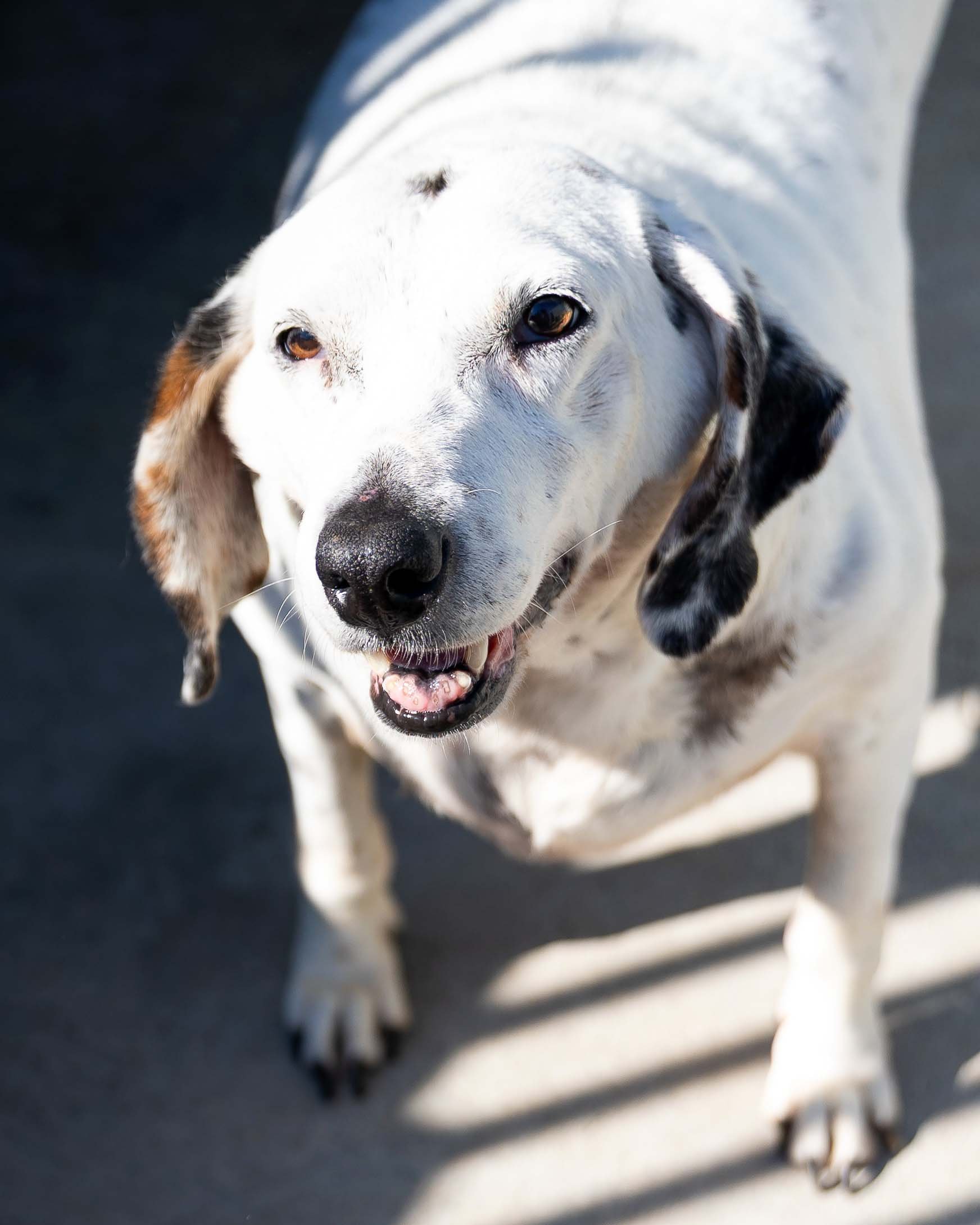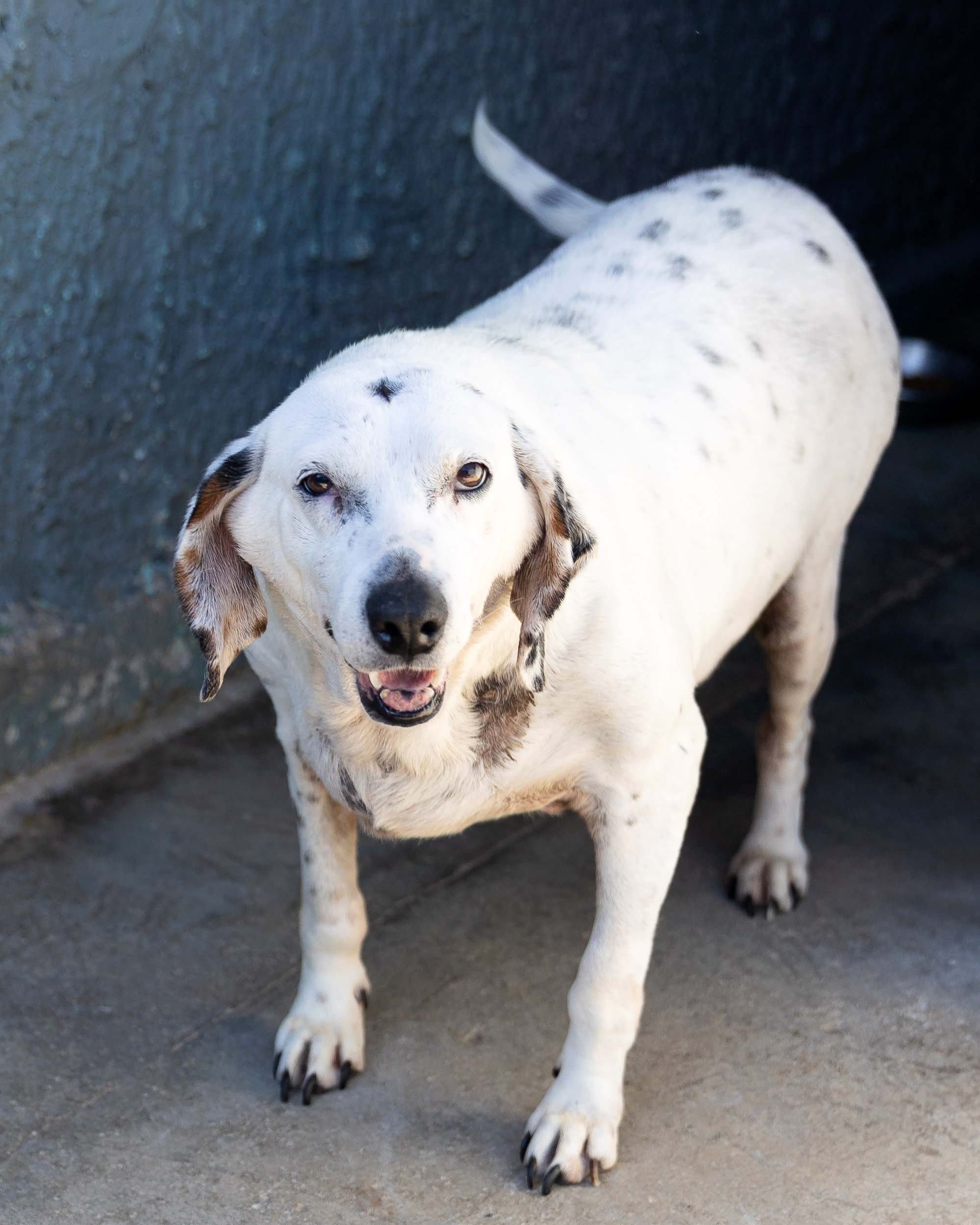 Fui resgatada após ser atropelada por uma van, disseram que ela passou por cima de mim. Eu estava tremendo muito, não conseguia andar e tinha uma bola na barriga. Estava caquética, cheia de pulgas e com dermatite. Eu tinha uma fratura no membro torácico, uma hérnia e piometra, precisei de cirurgia e transfusão de sangue de emergência. Agora já estou totalmente recuperada e lindona, só esperando por um lar!