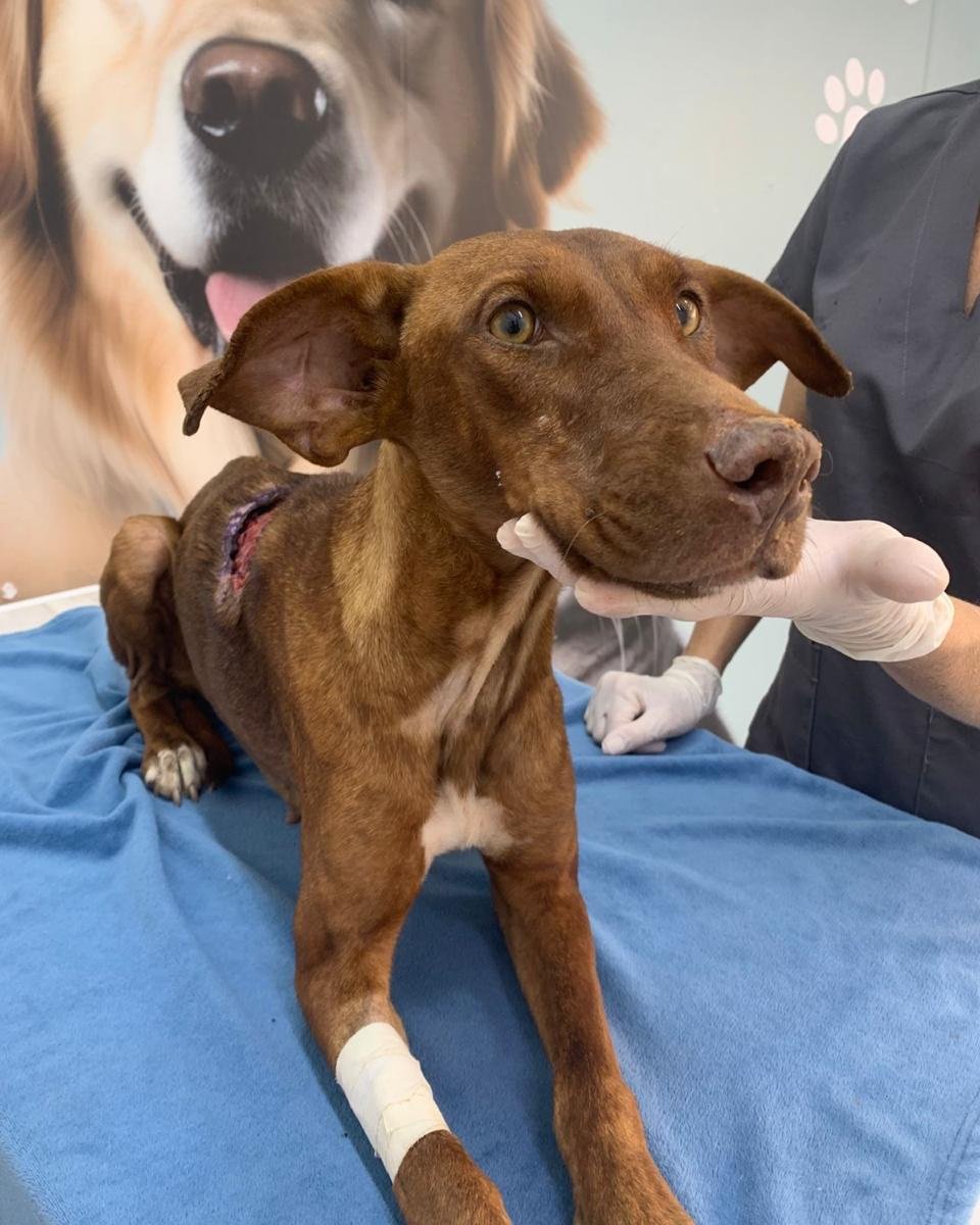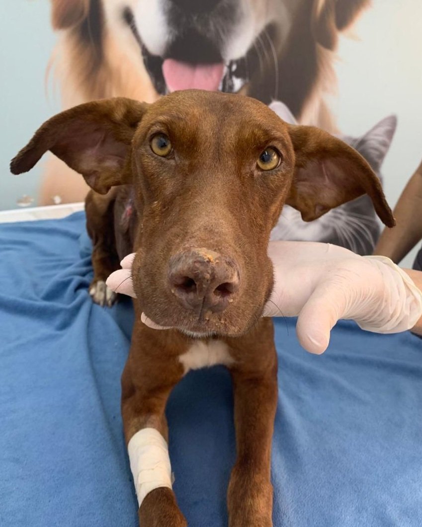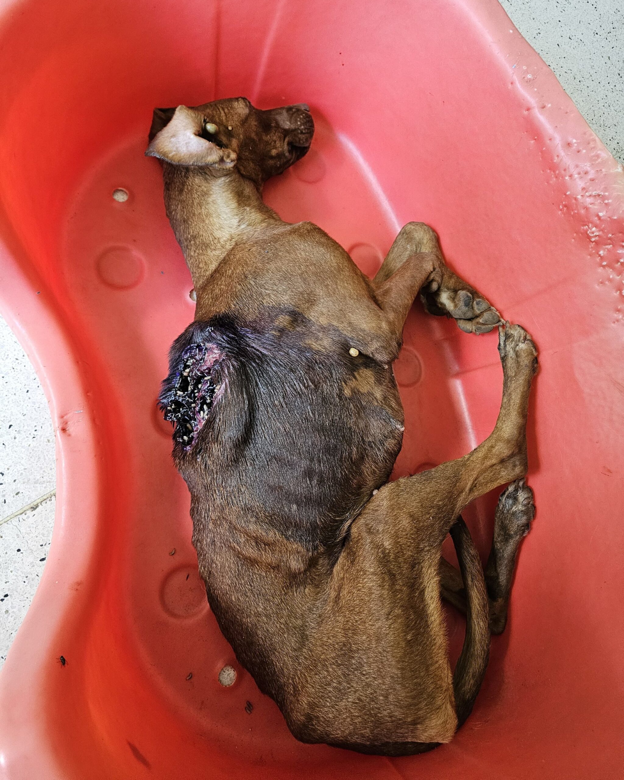 Fui resgatada após ser abandonada em uma região de mata afastada, estava com uma lesão gigantesca nas costas, os bichinhos estavam me devorando, infestada de carrapatos, desidratada e muito magra. Cheguei na clínica com muita dor e febre.