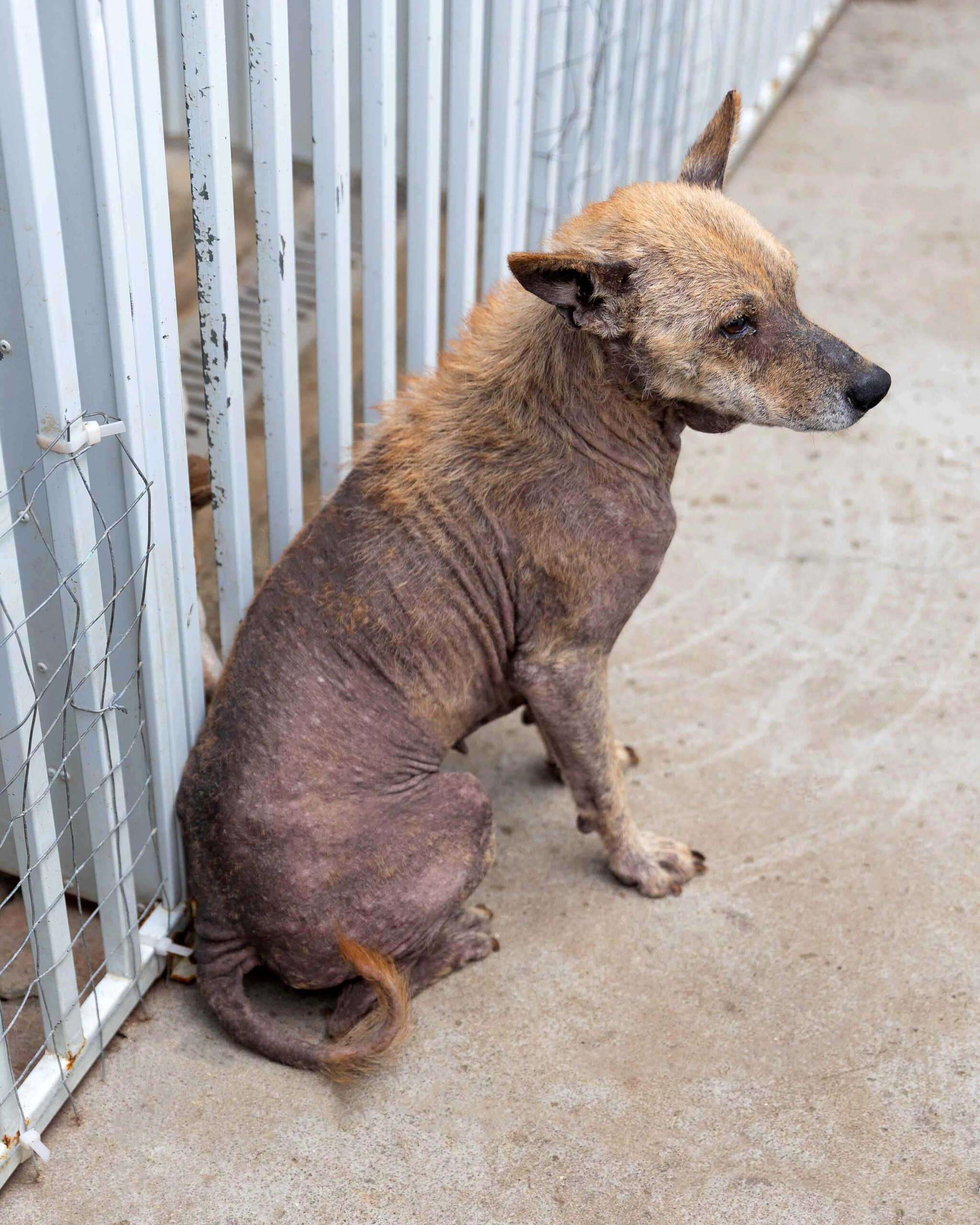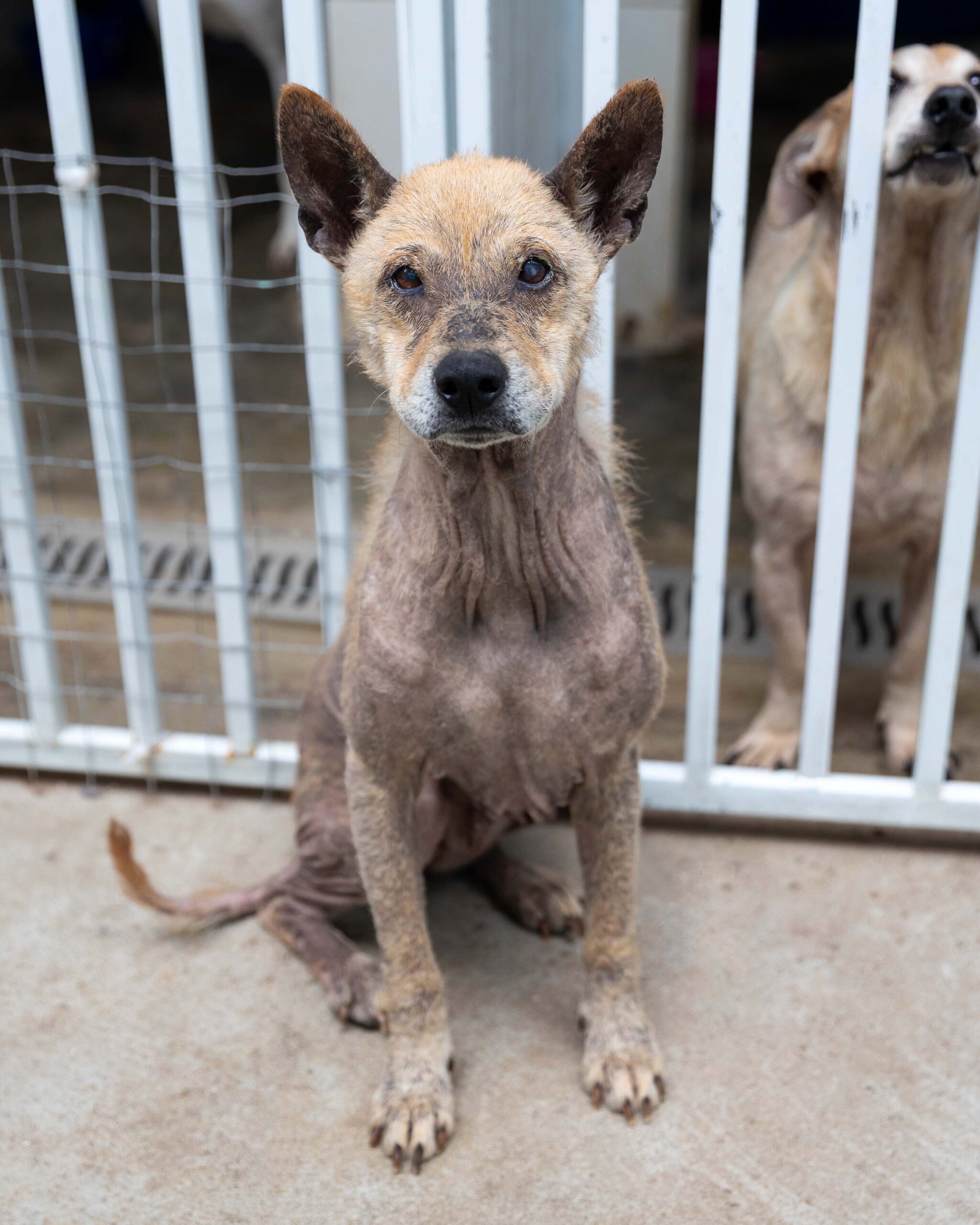 Fui resgatada após uma denúncia de maus-tratos, eu vivia com meu aumigo num porão, no meio da sujeira, lama e entulhos, tinham muitos ratos, eu não tinha comida e a água estava podre. Eu tinha muito medo, não sabia o que é ser tratada com carinho. Eu estava com muitos problemas de pele, alopecia generalizada, secreção nos olhos e bem magra. As tias vão fazer todo tratamento necessário.