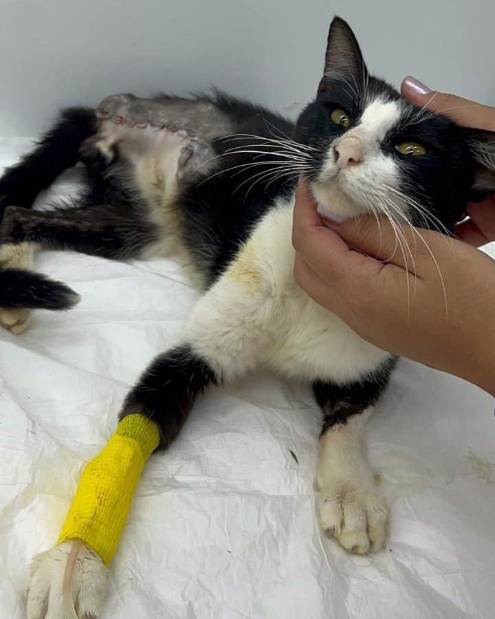 Fui resgatado após ser encontrado com uma fratura exposta gravíssima, os bichinhos já tinham devorado minha perninha, estavam só os ossos, provavelmente fui atropelado. Eu chorava muito de dor. Foi preciso cirurgia de emergência para amputação do que restou da minha perna porque o osso estava exposto há dias e era fonte de infecção. Ficarei internado até me recuperar.